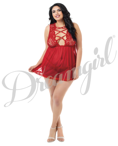 Stretch Mesh babydoll w/ lace cups, adjustable straps and a strappy panty is included.