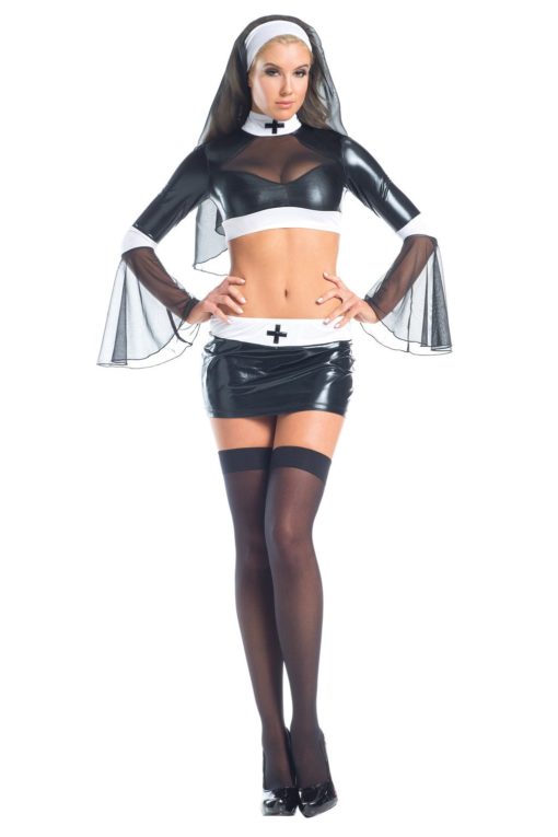3 Piece Naughty Nun. Skirt, long sleeve half top with attached collar, head piece.